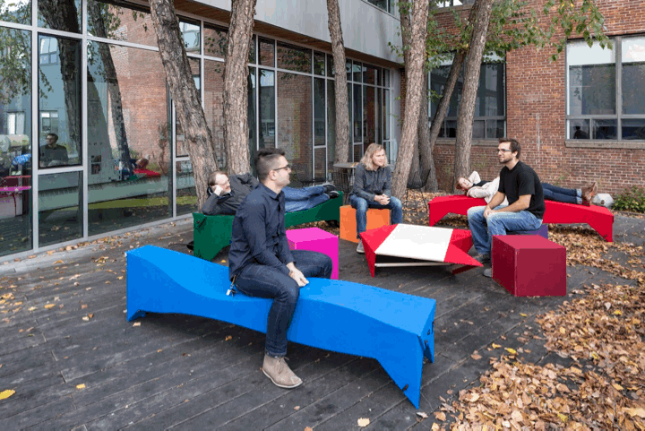 The focus of this year’s ABX+GreenBuild installation, No Tools Required, is to explore concepts of material interactions, joinery, and zero waste efficiency. We have created a collection of interactive furniture pieces using a simple and efficient construction technique that allows us to marry the sturdiness of plywood with the tensile strength of the fabric. Each of the pieces is created with either a full sheet or a half sheet of plywood, laminated with a layer of felt, CNC routed, and then folded and buckled. This ultimately results in a process in which no tools are needed for the assembly of each object, and no waste is left from the process of making.